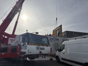 Cette semaine marque une étape clé du chantier avec la réception des murs et leur mise en place sur le toit. Une phase assez spectaculaire comme vous pouvez le constater :